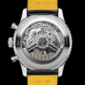 The 43 mm stainless steel case frames a silver dial accented by bold black chronograph subdials, creating the coveted “reverse panda” look. A red-tipped central chronograph hand adds a contemporary touch, while the signature circular slide-rule bezel remains true to its pilot watch roots.