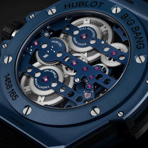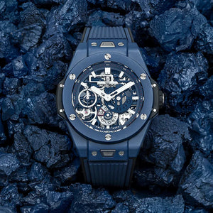 The Hublot Big Bang Meca-10 Ceramic Blue 45mm combines futuristic materials with groundbreaking mechanics. Its deep blue ceramic case paired with a skeletonized dial reveals the HUB1201 calibre and its extraordinary 10-day power reserve, setting it apart from most modern mechanical watches. Rugged yet refined, with a structured rubber strap and 100 m water resistance, this watch offers both everyday resilience and bold individuality. A true showcase of Hublot’s philosophy: the art of fusion.
