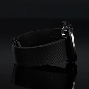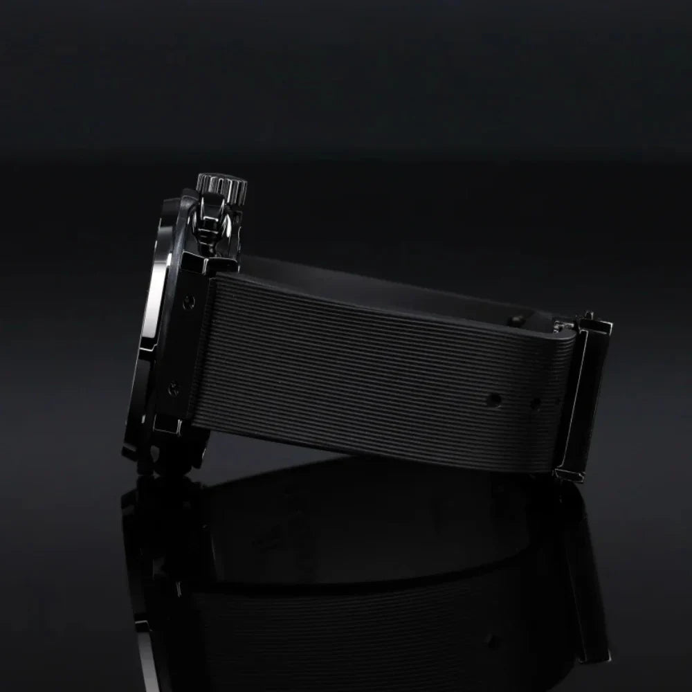 Bracelet: Black lined rubber strap with stainless steel and black-plated deployant clasp