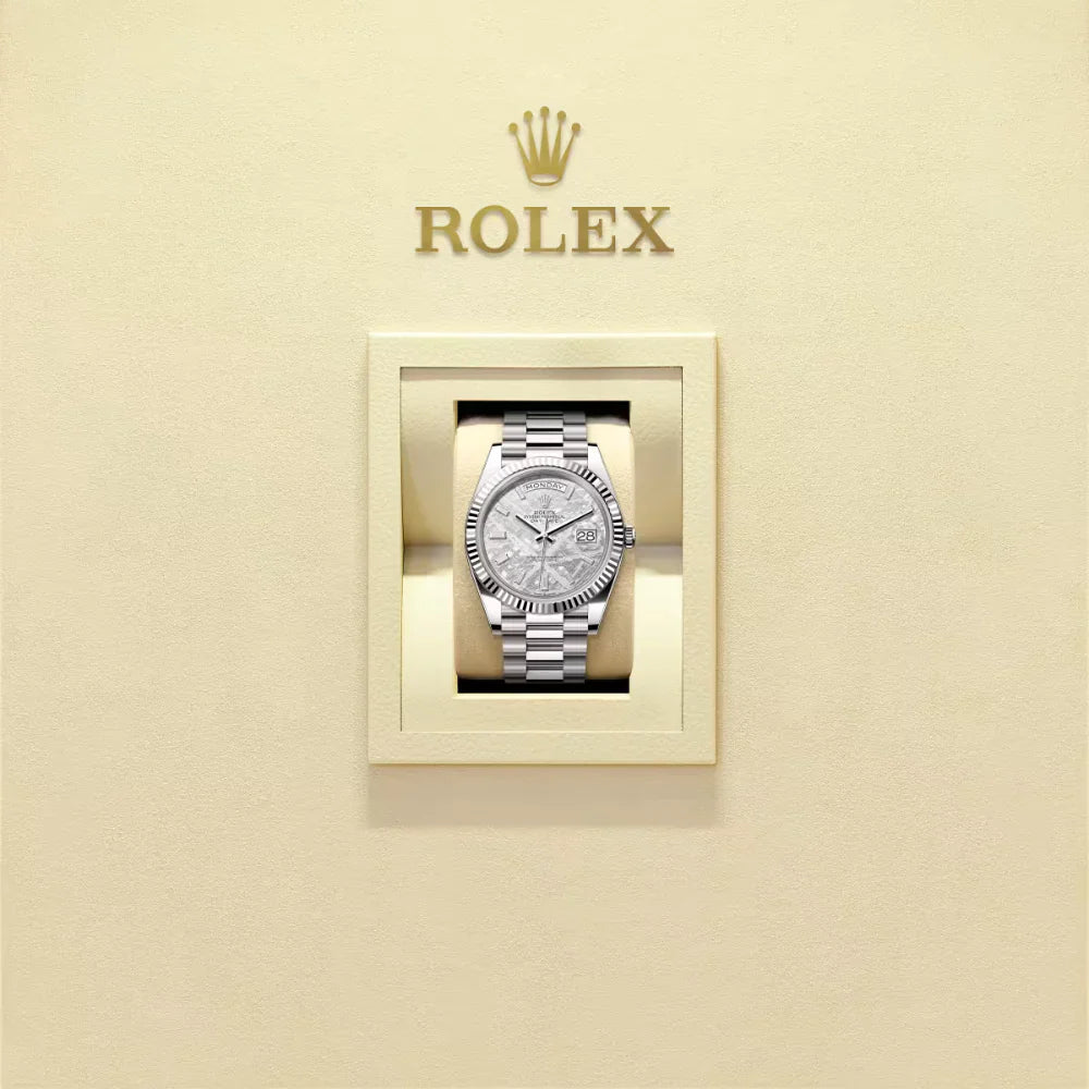 The RL Day-Date 40 Ref. 228239 is more than a watch — it is a legacy of craftsmanship, luxury, and precision. With its meteorite dial, baguette-cut diamonds, and full white gold construction, it represents the pinnacle of RL’s artistry, designed for leaders and collectors who demand true exclusivity.