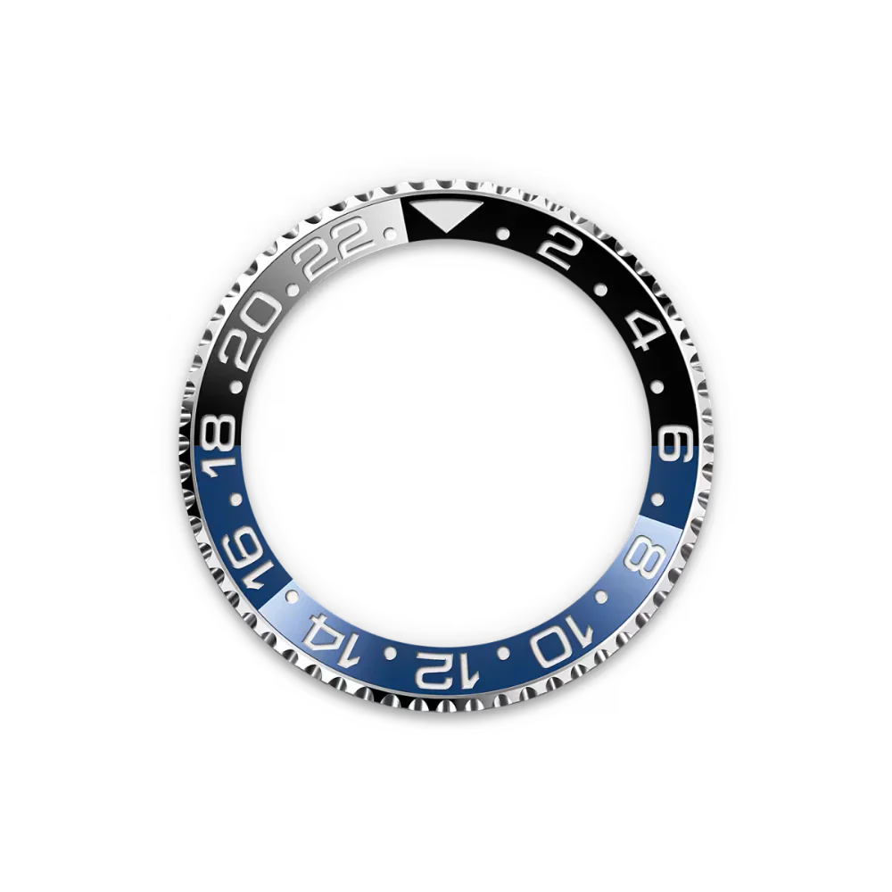 Bezel: Bidirectional rotatable Cerachrom insert in black & blue ceramic with 24-hour scale