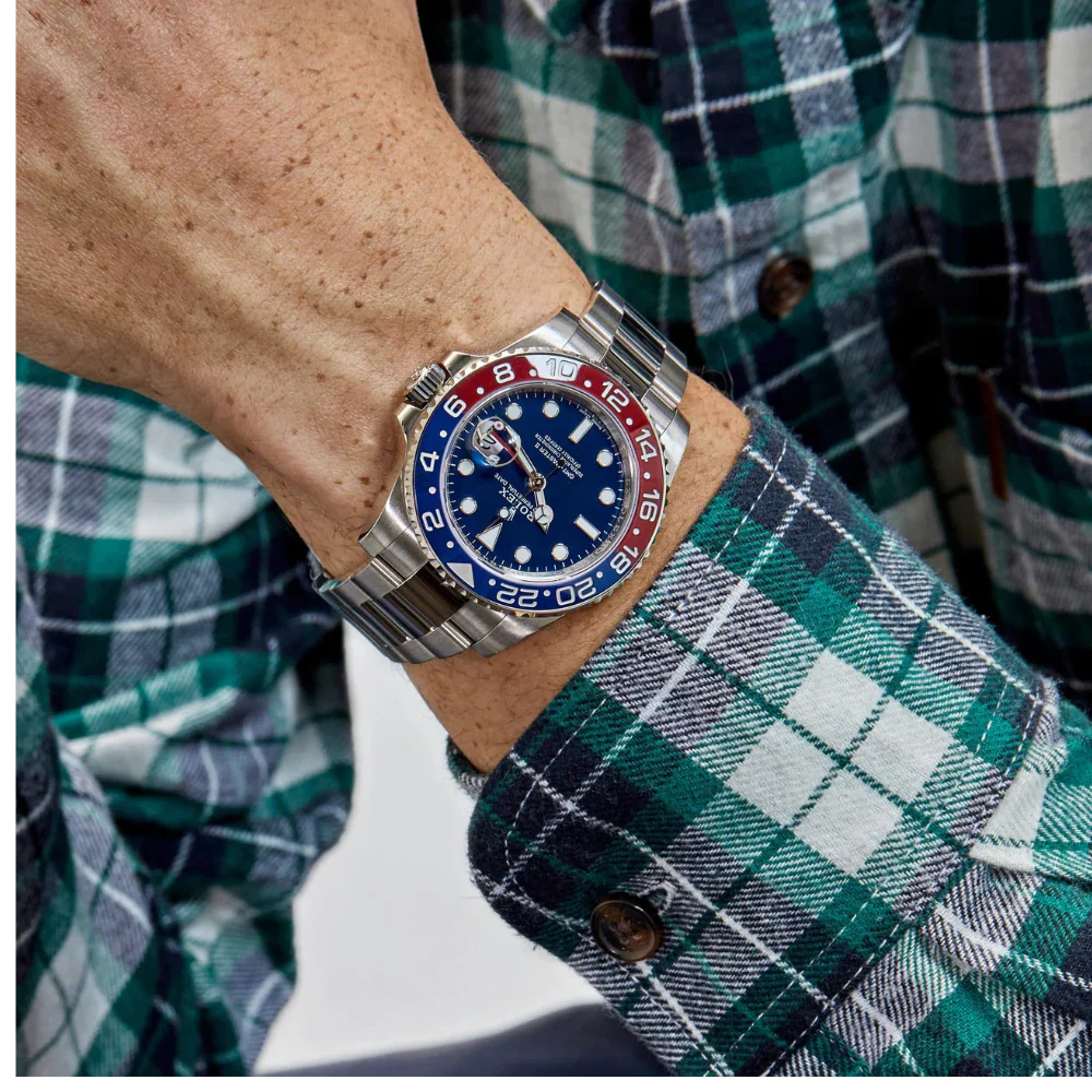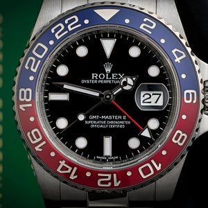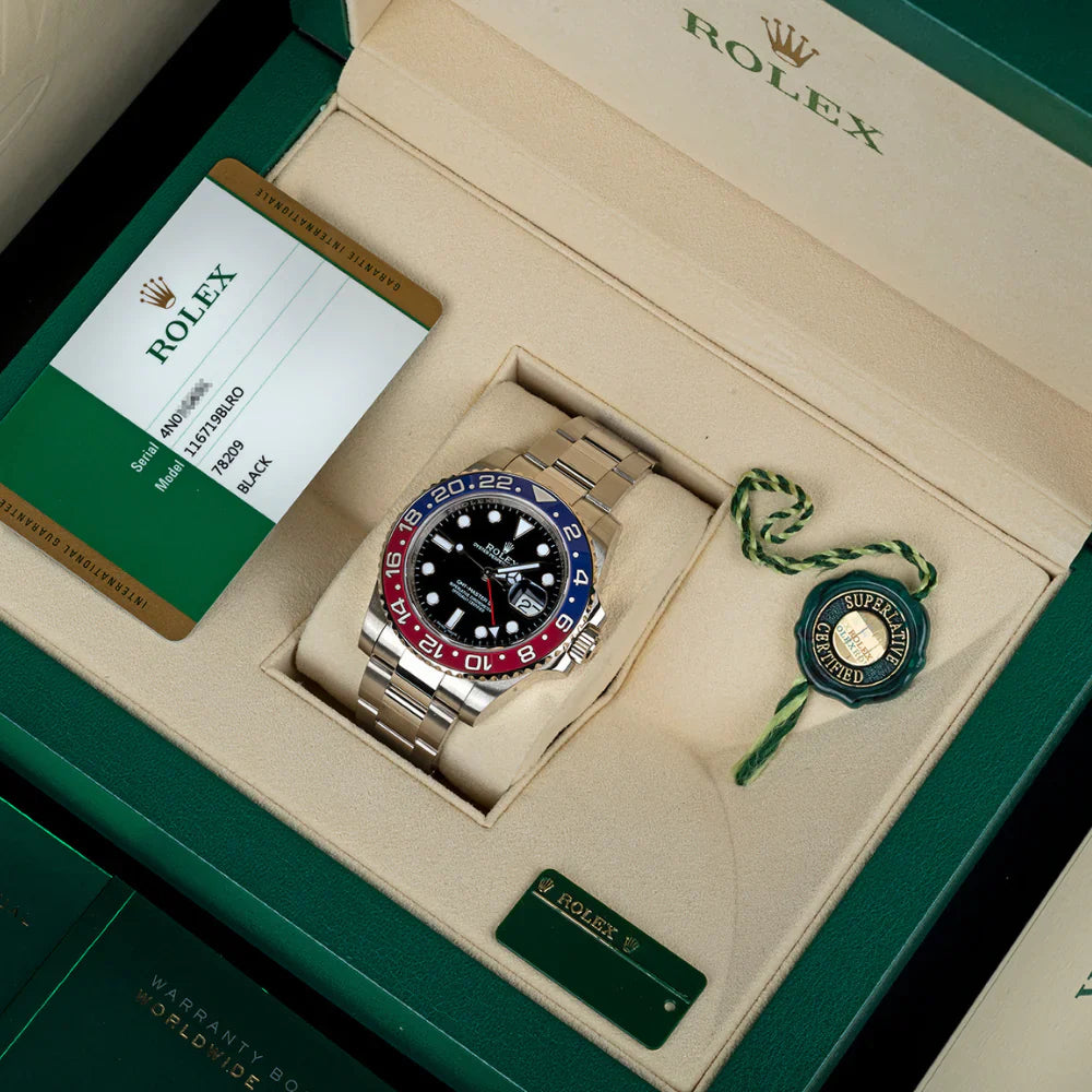 Prestigious 18k white gold case paired with the iconic red & blue “Pepsi” bezel