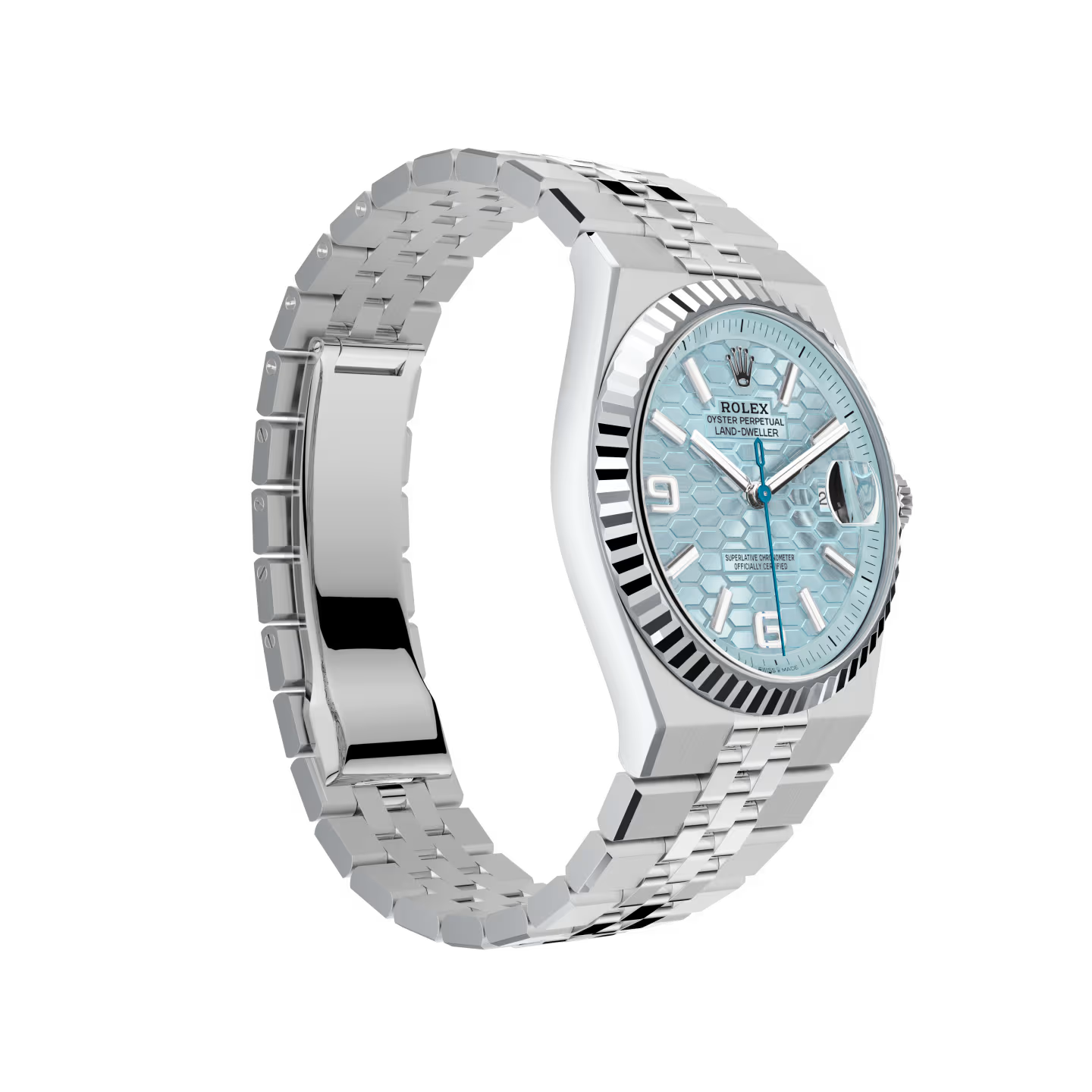 The RL Land-Dweller 40 Ref. 127336-0001 is a stunning new model crafted in 950 platinum — a first for the Land-Dweller collection. This watch features a blue dial with radial motif, elegant Roman numerals, and RL’s signature fluted bezel also rendered in platinum. It is the epitome of prestige, elegance, and mechanical mastery.