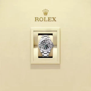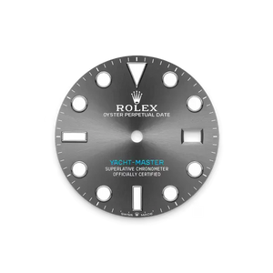 Its signature feature — a bidirectional 60-minute platinum bezel with raised polished numerals — provides a superior tactile experience and outstanding corrosion resistance. The rhodium grey dial, highlighted by the aqua blue seconds hand and the “Yacht-Master” inscription, introduces a modern yet subtle touch of color.